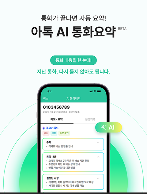 ● 아톡 AI 통화요약 서비스(BETA) 이제 통화가 종료되면 AI가 자동으로 대화를 분석해 통화 요약을 생성합니다. 통화 주제 · 주요 내용 · 할 일 등을 한눈에 볼 수 있으며, 모든 통화 내용은 텍스트로 변환되어 보다 편리하게 확인하실 수 있습니다.